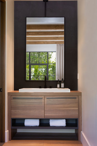 The contemporary living space and backs directly up to the Club’s golf course. In addition to the color scheme, the bathroom design also takes up the idea of open space: